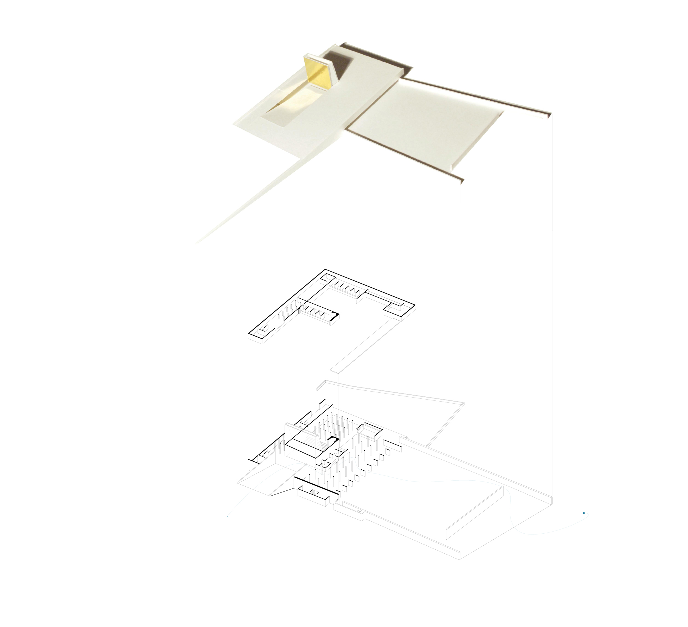De l’intérieur, une rampe annonce l’extérieur, puis dessine un vide dans la couverture, définie par un plan doré, qui indique le début ou la fin du parcours. Ceci permet, d’emblée, la construction d’un lanterneau qui illumine la salle de lecture de la bibliothèque.