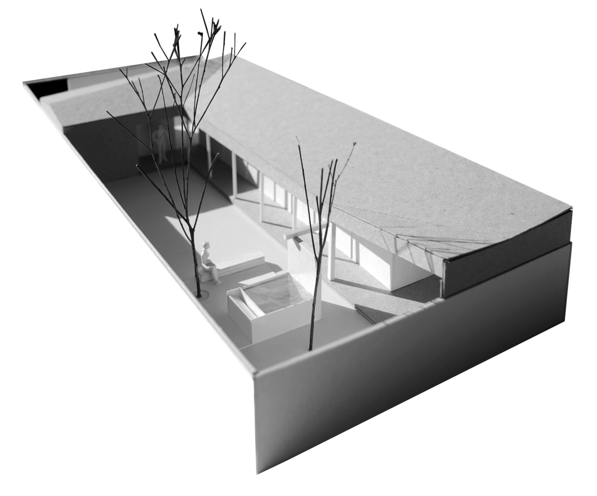 Deux cours ont été créées. La première, qui est plus petite que la deuxième, établit un lien direct avec la rue et se trouve à l’entrée de la maison. La deuxième garantit l’intimité des chambres et son parcours a une galerie couverte. Un réservoir et une citerne permettent le stockage d’eau et l’entretien d’un potager privé.