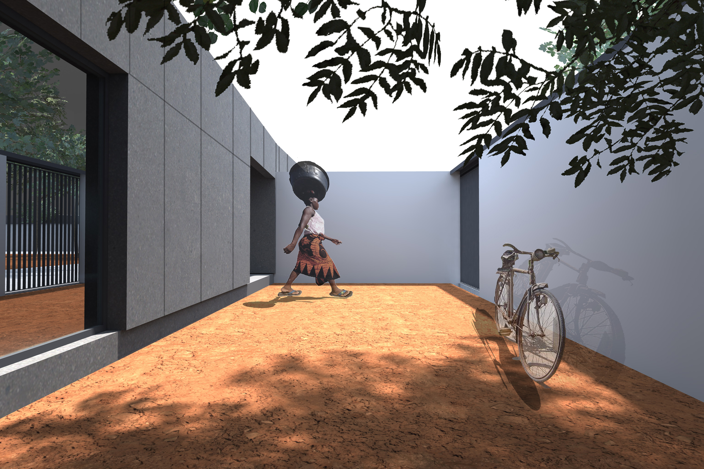 La toiture, comprenant plusieurs inclinaisons, permet de recueillir les eaux pluviales en cas de pénurie et définit l’espace de chaque compartiment de la maison: salle, cuisine, 4 ou 5 chambres, 2 installations sanitaires et un espace extérieur couvert. Les habitants pourront s’approprier de la maison de façon spontanée et vivre librement les cours.