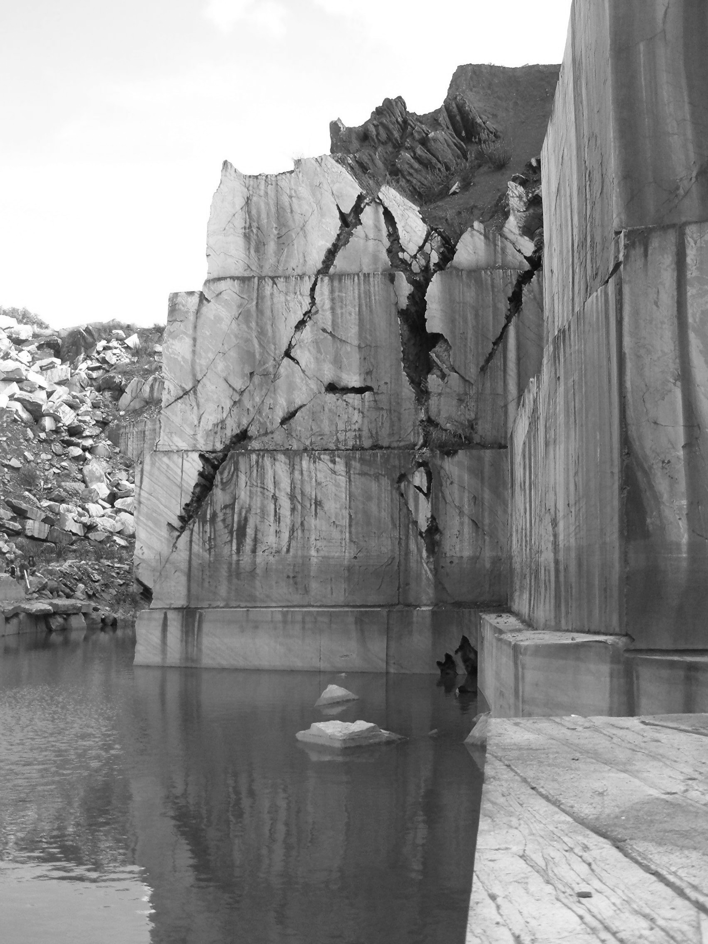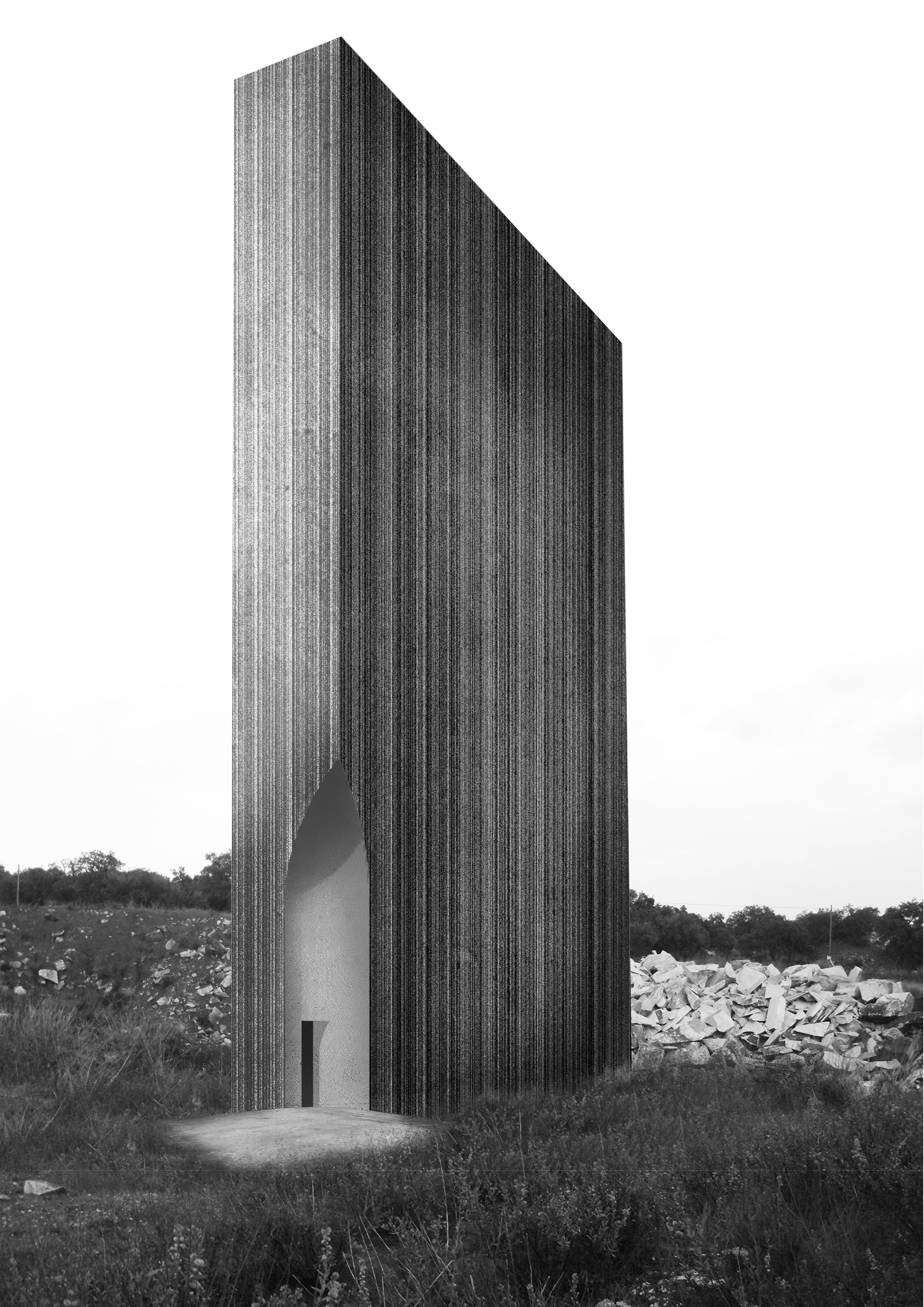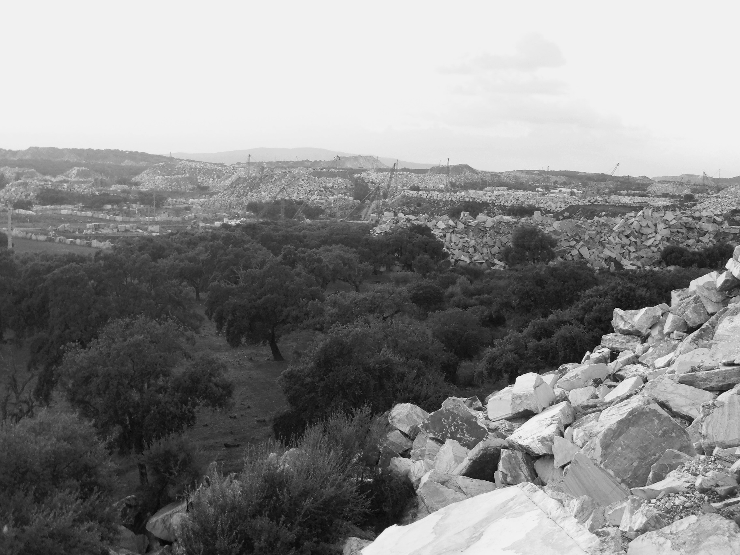 Located at a point exterior to the large rock mass, the abandoned quarry is taken as a meeting point between the agricultural landscape and the mechanized extraction process in the quarries. The house, is assumed as a point of reference in this faint landscape which is only noticeable when approaching the territory.